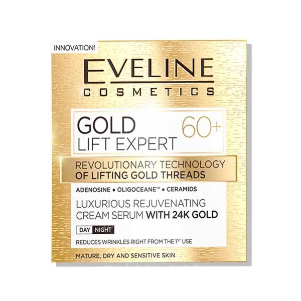 ექსკლუზიური გამაახაზრდავებელი საცხი+შრატი 24კ. ოქრო 60+ ჯგუფიდანGOLD LIFT EXPERT, 50მლ EVELINE