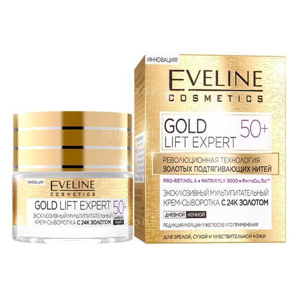 ექსკლუზიური მულტიმკვებავი საცხი+შრატი 24კ.ოქრო 50+ ჯგუფიდან GOLD LIFT EXPERT, 50მლ EVELINE