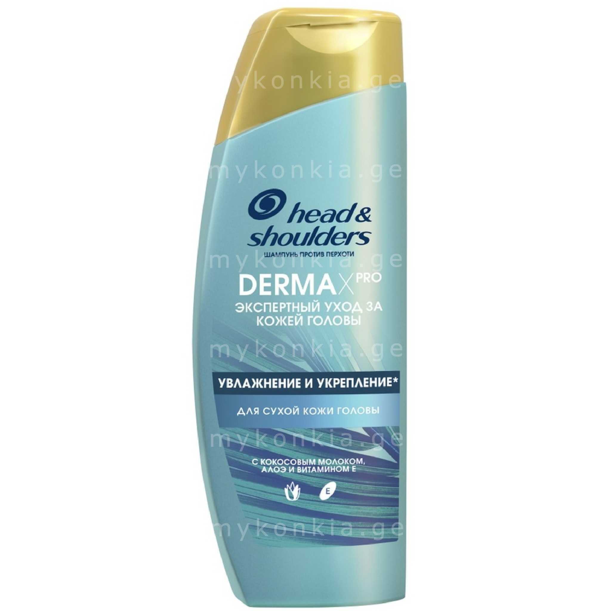 Head &Shoulders DERMAXpro ქერტლის საწინააღმდეგო შამპუნი თავის მშრალი კანისთვის ქოქოსის რძით, ალოე და E ვიტამინით. თმის სიძლიერისა და დატენიანებისათვის. მოხმარების წესი: დაიტანეთ სველ თმასა და თავის კანზე, აიქაფეთ, ჩამოიბანეთ. ყურადღება: მოარიდეთ თვალთან კონტაქტს. თვალთან მოხვედრის შემთხვევაში, დაიბანეთ დიდი რაოდენობით წყლით. შემადგენლობა: იხ.შეფუთვაზე. წარმოებულია რუმინეთში. მწარმოებელი: მწარმოებელი: ეს.სი. დეტერგანტი.ეს.ეი., მიჰაი ვიტეაზუს ქ., 1, 106300 ურლატი, რუმინეთი. ვარგისიანობის ვადა: შეფუთვაზე მითითებული წარმოების თარიღიდან 3 წლის განმავლობაში. 270 მლ. ვადაგასული/გაუვარგისებული პროდუქტი განადგურდება საყოფაცხოვრებო ნარჩენთან ერთად. იმპორტიორ-დისტრიბუტორი: შპს „დიპლომატ ჯორჯია“ ისანი-სამგორის რ-ნი, თ.ჩანტლაძის ქ. I შეს. №10, 0109 თბილისი, საქართველო. ტ: 2919293. 8006540444399